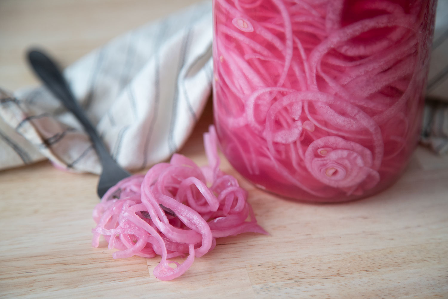 Mettre les oignons dans un gros pot Mason de 1 litre. Verser le vinaigre chaud dans le pot.