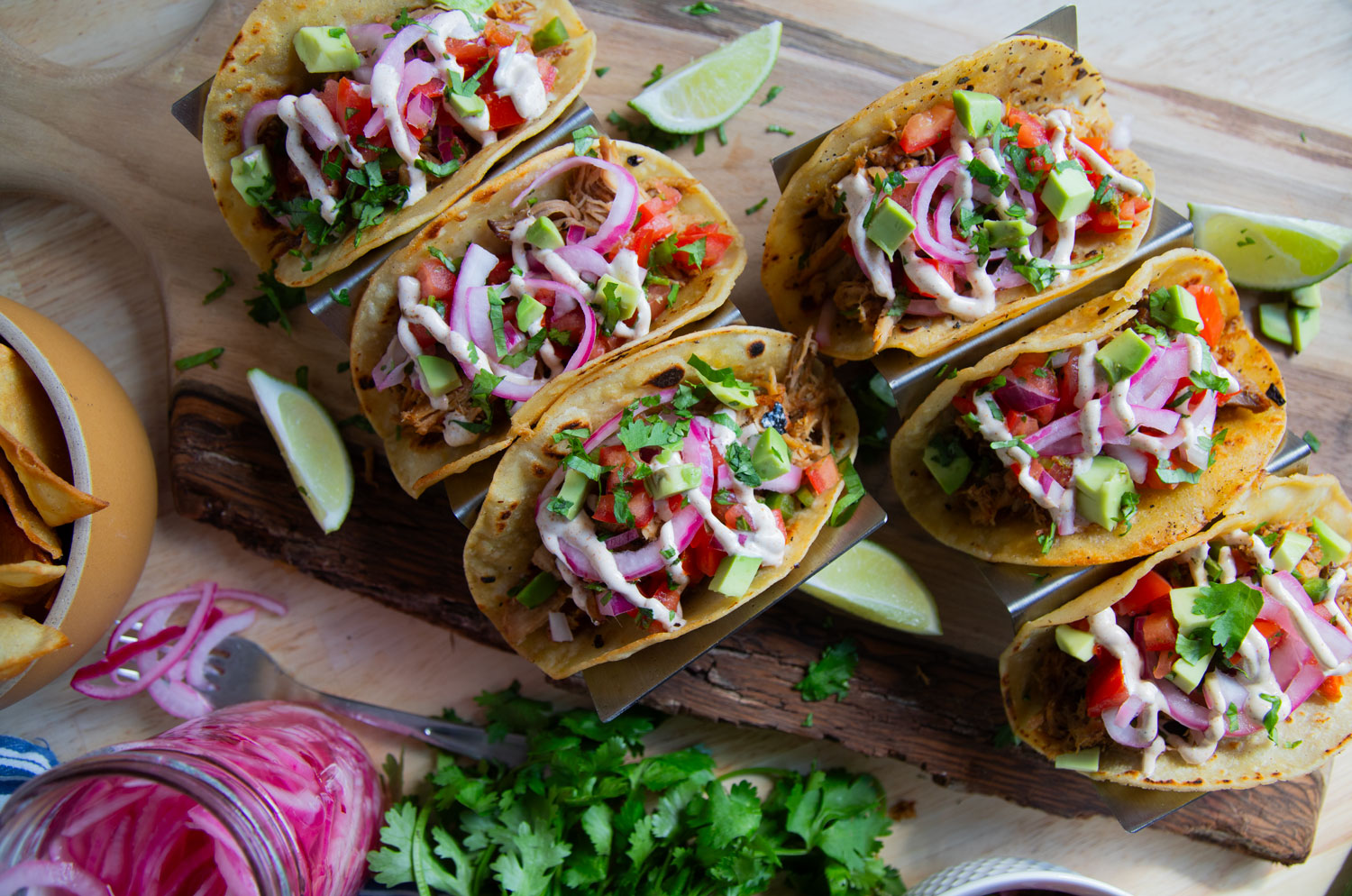 Dans chaque tacos, déposer un peu de porc effiloché. Garnir de pico de gallo, d’oignon mariné, d’avocat, de coriandre. Garnir d’un peu de sauce à la lime et de fromage au goût.